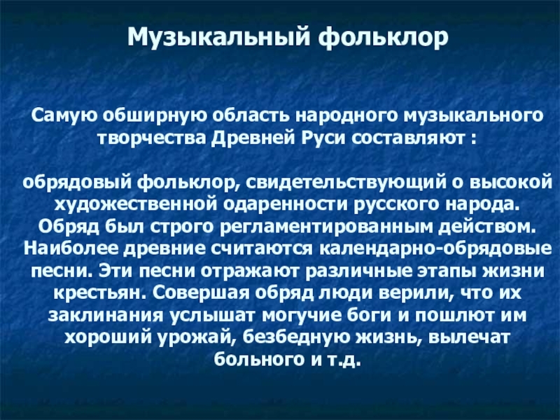 Музыкальный фольклор   Самую обширную область народного музыкального творчества Древней Руси составляют :  обрядовый фольклор,