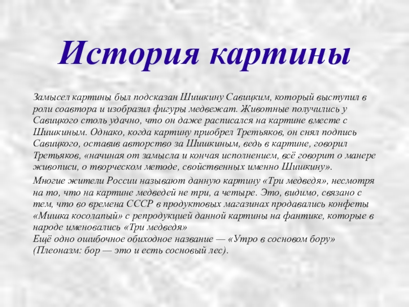 Ещё одно ошибочное обиходное название — «Утро в сосновом бору» (Плеоназм: бор — это и есть сосновый лес).
