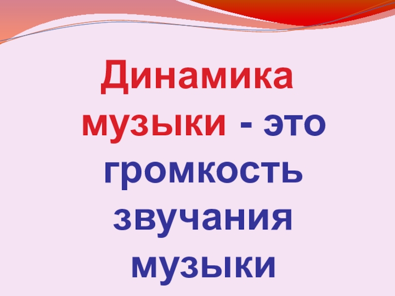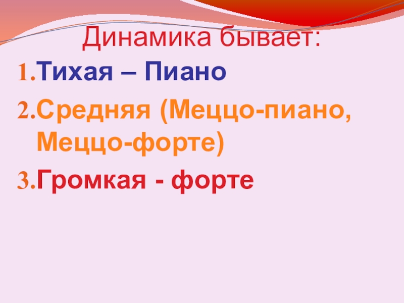 Динамика бывает:Тихая – ПианоСредняя (Меццо-пиано, Меццо-форте)Громкая - форте