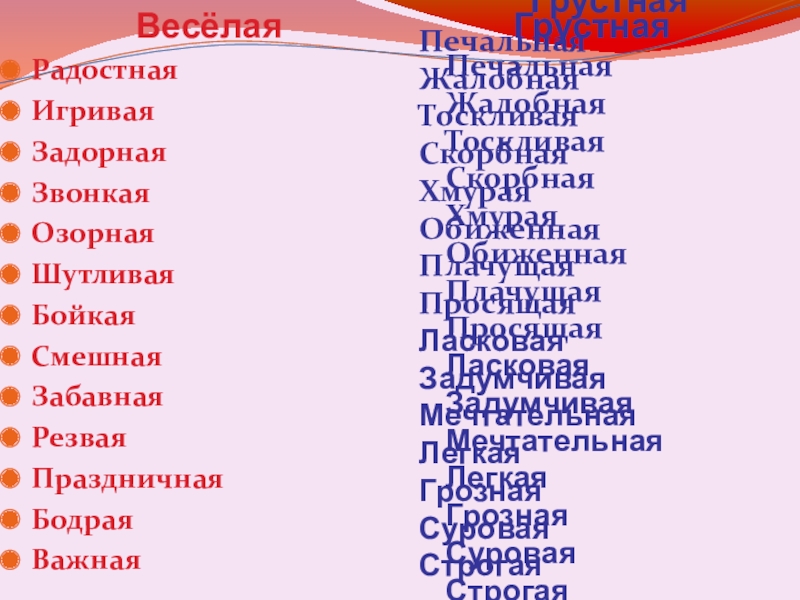ГрустнаяПечальнаяЖалобнаяТоскливаяСкорбнаяХмураяОбиженнаяПлачущаяПросящаяЛасковаяЗадумчиваяМечтательнаяЛегкаяГрознаяСуроваяСтрогаяВесёлаяРадостнаяИгриваяЗадорнаяЗвонкаяОзорнаяШутливаяБойкаяСмешнаяЗабавнаяРезваяПраздничнаяБодраяВажнаяГрустнаяПечальнаяЖалобнаяТоскливаяСкорбнаяХмураяОбиженнаяПлачущаяПросящаяЛасковаяЗадумчиваяМечтательнаяЛегкаяГрознаяСуроваяСтрогая