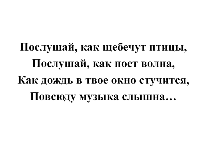 Послушай, как щебечут птицы,Послушай, как поет волна,Как дождь в твое окно стучится,Повсюду музыка слышна…