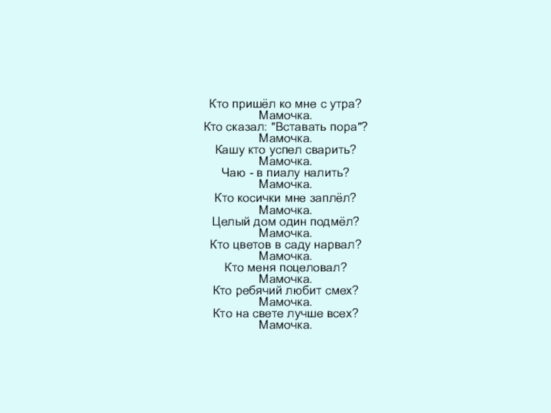 Кто косички мне заплёл? Мамочка. Целый дом один подмёл? Мамочка. Кто цветов в садy наpвал? Мамочка. Кто меня поцеловал? Мамочка. Кто pебячий любит смех? Мамочка. Кто на свете лyчше всех? Мамочка.