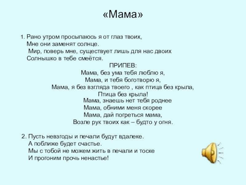 «Мама»    1. Рано утром просыпаюсь я от глаз твоих,    Мне они