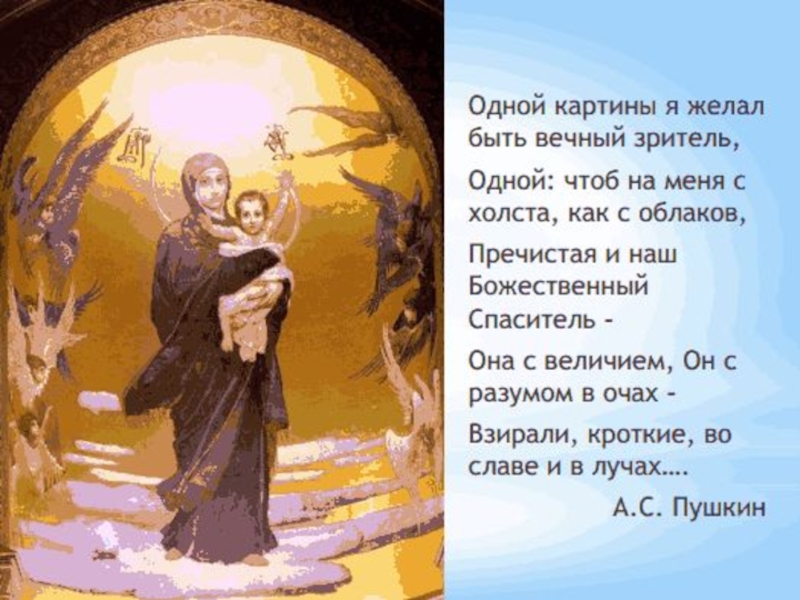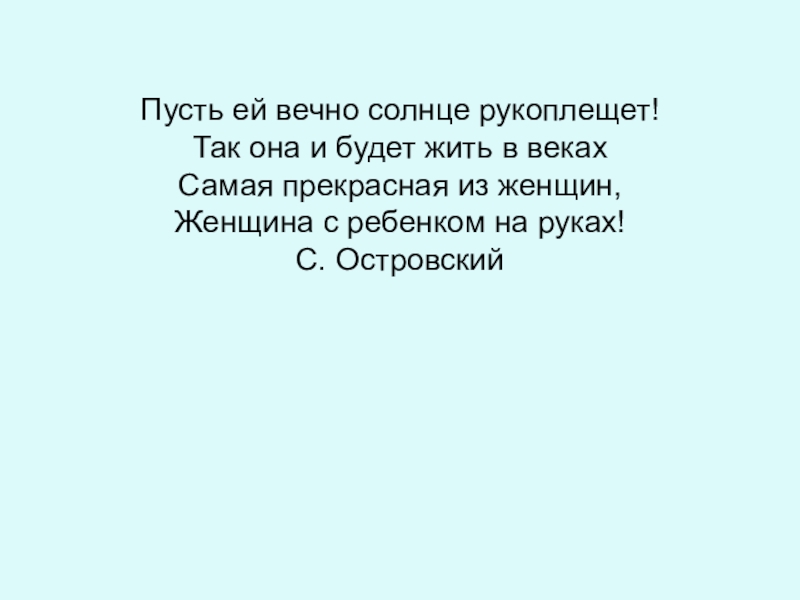 Пусть ей вечно солнце рукоплещет! Так она и будет жить в веках Самая прекрасная из женщин, Женщина с ребенком на руках! С. Островский
