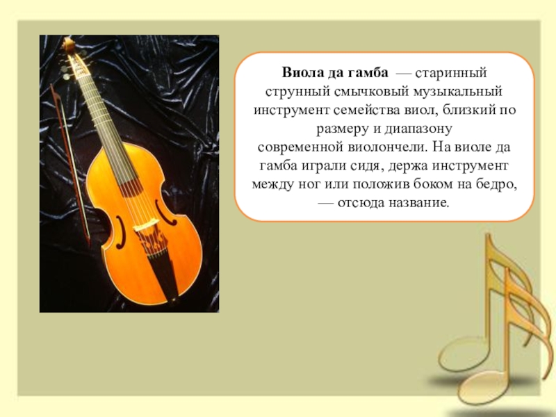 по размеру и диапазону современной виолончели. На виоле да гамба играли сидя, держа инструмент между ног или положив боком на бедро, — отсюда название.