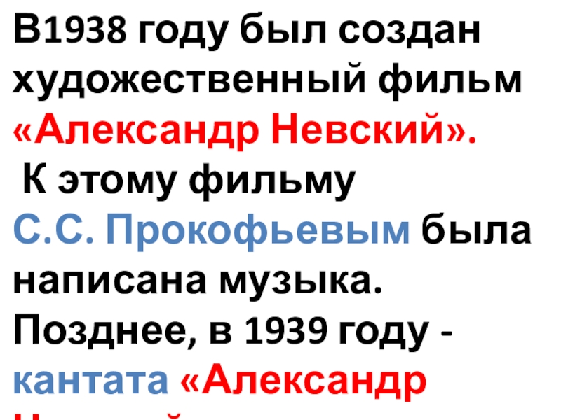 В1938 году был создан художественный фильм «Александр Невский». К этому фильму С.С. Прокофьевым была написана музыка. Позднее,