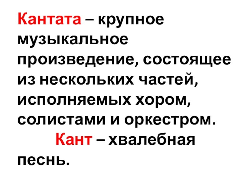 Слайд 6Кантата – крупное музыкальное произведение, состоящее из нескольких частей, исполняемых хором,