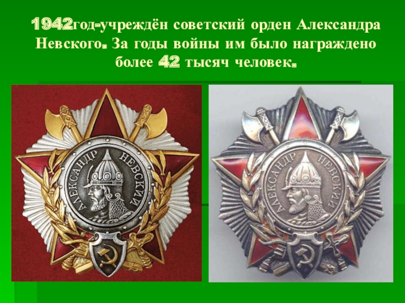 Слайд 161942год-учреждён советский орден Александра Невского. За годы войны им было награждено