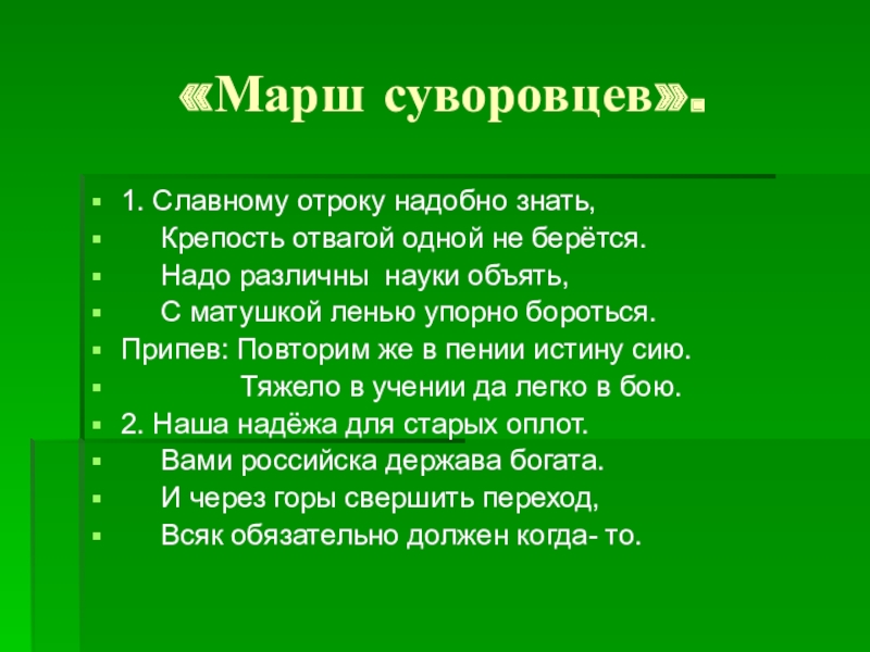 «Марш суворовцев».1. Славному отроку надобно знать,   Крепость отвагой одной не берётся.   Надо различны