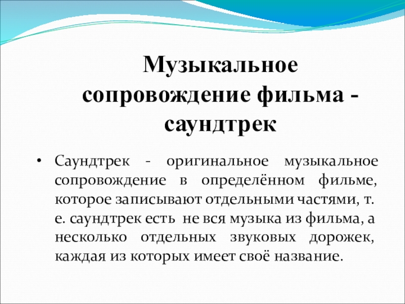 Музыкальное сопровождение фильма - саундтрекСаундтрек - оригинальное музыкальное сопровождение в определённом фильме, которое записывают отдельными частями, т.