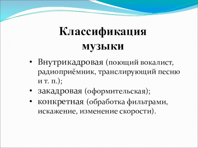 Классификация музыкиВнутрикадровая (поющий вокалист, радиоприёмник, транслирующий песню и т. п.);закадровая (оформительская);конкретная (обработка фильтрами, искажение, изменение скорости).