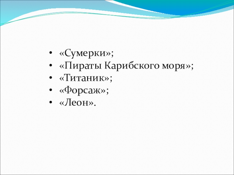 «Сумерки»;«Пираты Карибского моря»;«Титаник»;«Форсаж»;«Леон».