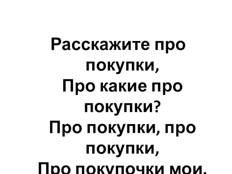 Слайд 3Расскажите про покупки, Про какие про покупки? Про покупки, про покупки, Про покупочки мои.