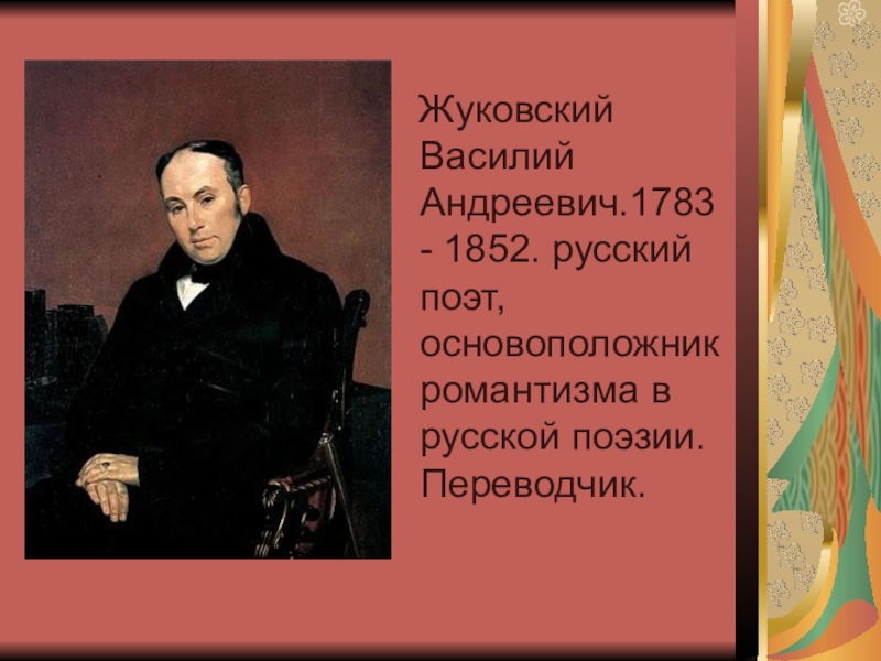 Жуковский Василий Андреевич.1783- 1852. русский поэт, основоположник романтизма в русской поэзии. Переводчик.