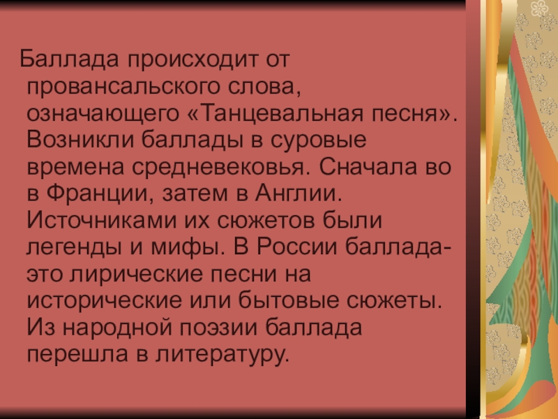 баллады в суровые времена средневековья. Сначала во в Франции, затем в Англии. Источниками их сюжетов были легенды и мифы. В России баллада- это лирические песни на исторические или бытовые сюжеты. Из народной поэзии баллада перешла в литературу.