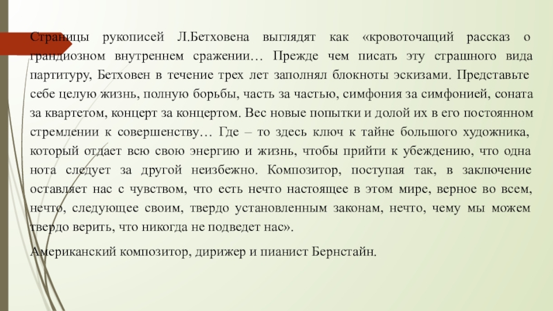 Прежде чем писать эту страшного вида партитуру, Бетховен в течение трех лет заполнял блокноты эскизами. Представьте себе целую жизнь, полную борьбы, часть за частью, симфония за симфонией, соната за квартетом, концерт за концертом. Вес новые попытки и долой их в его постоянном стремлении к совершенству… Где – то здесь ключ к тайне большого художника, который отдает всю свою энергию и жизнь, чтобы прийти к убеждению, что одна нота следует за другой неизбежно. Композитор, поступая так, в заключение оставляет нас с чувством, что есть нечто настоящее в этом мире, верное во всем, нечто, следующее своим, твердо установленным законам, нечто, чему мы можем твердо верить, что никогда не подведет нас».