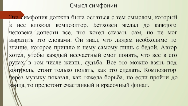 в нее вложил композитор. Бетховен желал до каждого человека донести все, что хотел сказать сам, но не мог выразить это словами. Он знал, что людям необходимо то знание, которое пришло к нему самому лишь с бедой. Автор хотел, чтобы каждый несчастный смог понять, что все в его руках, в том числе жизнь, судьба. Все это можно взять под контроль, стоит только понять, как это сделать. Композитор через музыку показал, как тяжела борьба, но если пройти до конца, то предстоит счастливый и красочный финал.