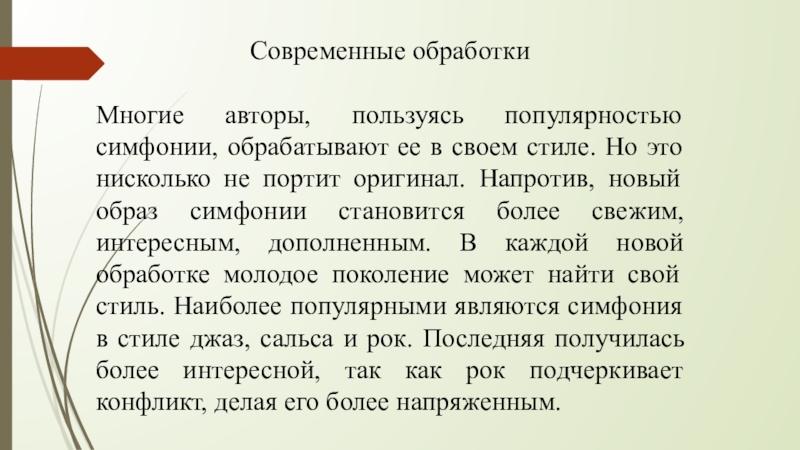 стиле. Но это нисколько не портит оригинал. Напротив, новый образ симфонии становится более свежим, интересным, дополненным. В каждой новой обработке молодое поколение может найти свой стиль. Наиболее популярными являются симфония в стиле джаз, сальса и рок. Последняя получилась более интересной, так как рок подчеркивает конфликт, делая его более напряженным.