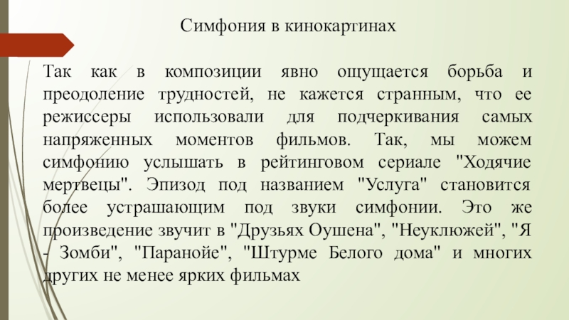 преодоление трудностей, не кажется странным, что ее режиссеры использовали для подчеркивания самых напряженных моментов фильмов. Так, мы можем симфонию услышать в рейтинговом сериале "Ходячие мертвецы". Эпизод под названием "Услуга" становится более устрашающим под звуки симфонии. Это же произведение звучит в "Друзьях Оушена", "Неуклюжей", "Я - Зомби", "Паранойе", "Штурме Белого дома" и многих других не менее ярких фильмах
