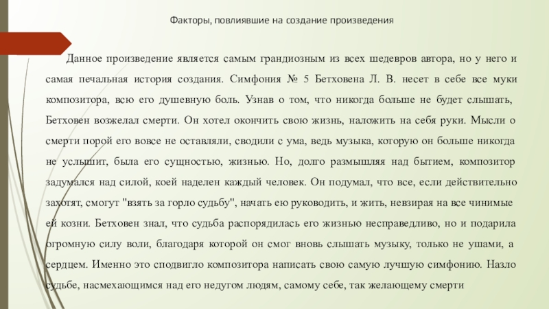 всех шедевров автора, но у него и самая печальная история создания. Симфония № 5 Бетховена Л. В. несет в себе все муки композитора, всю его душевную боль. Узнав о том, что никогда больше не будет слышать, Бетховен возжелал смерти. Он хотел окончить свою жизнь, наложить на себя руки. Мысли о смерти порой его вовсе не оставляли, сводили с ума, ведь музыка, которую он больше никогда не услышит, была его сущностью, жизнью. Но, долго размышляя над бытием, композитор задумался над силой, коей наделен каждый человек. Он подумал, что все, если действительно захотят, смогут "взять за горло судьбу", начать ею руководить, и жить, невзирая на все чинимые ей козни. Бетховен знал, что судьба распорядилась его жизнью несправедливо, но и подарила огромную силу воли, благодаря которой он смог вновь слышать музыку, только не ушами, а сердцем. Именно это сподвигло композитора написать свою самую лучшую симфонию. Назло судьбе, насмехающимся над его недугом людям, самому себе, так желающему смерти