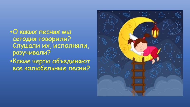 О каких песнях мы сегодня говорили? Слушали их, исполняли, разучивали?Какие черты объединяют все колыбельные песни?