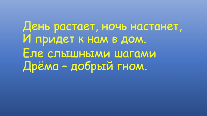 День растает, ночь настанет, И придет к нам в дом.Еле слышными шагами Дрёма – добрый гном.