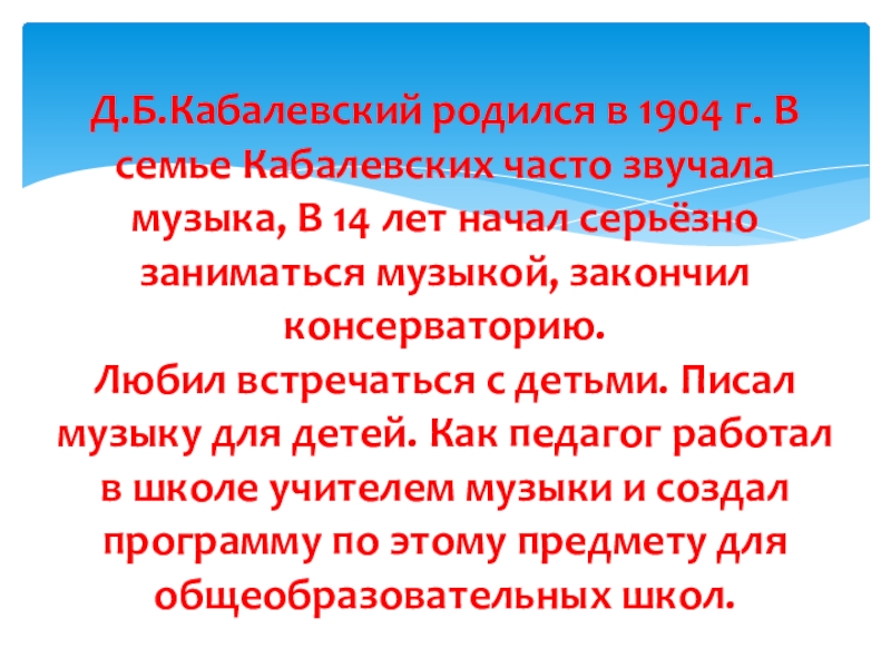 Д.Б.Кабалевский родился в 1904 г. В семье Кабалевских часто звучала музыка, В 14 лет начал серьёзно заниматься