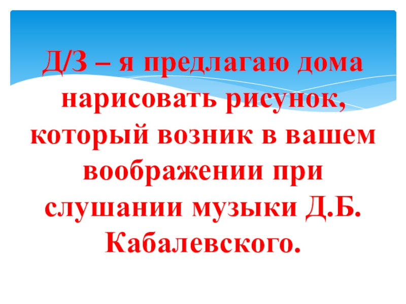 Д/З – я предлагаю дома нарисовать рисунок, который возник в вашем воображении при слушании музыки Д.Б.Кабалевского.