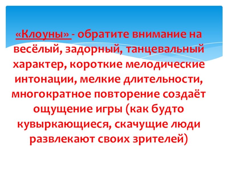 Слайд 5«Клоуны» - обратите внимание на весёлый, задорный, танцевальный характер, короткие мелодические