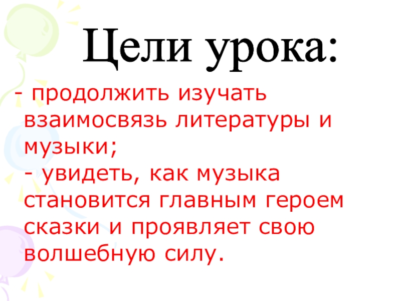 Цели урока: продолжить изучать взаимосвязь литературы и музыки;- увидеть, как музыка становится главным героем сказки и проявляет