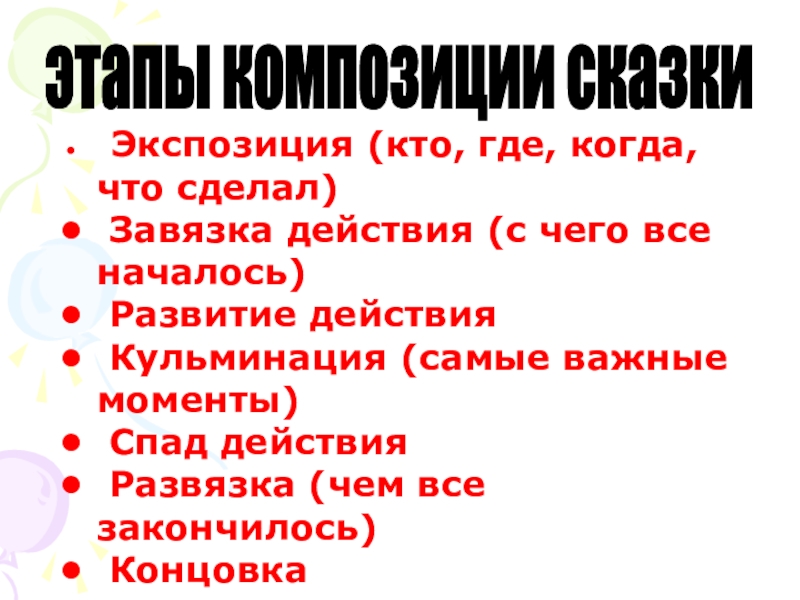 этапы композиции сказки  Экспозиция (кто, где, когда, что сделал) Завязка действия (с чего все началось) Развитие