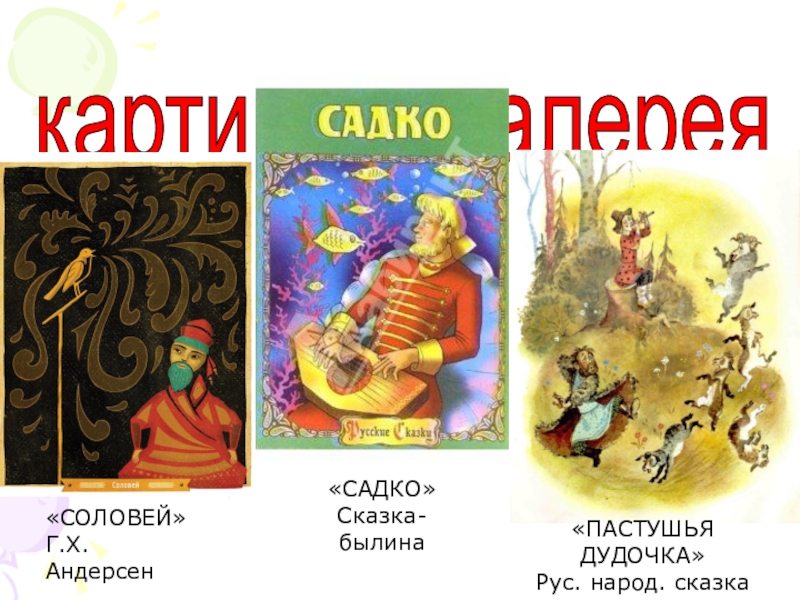 картинная галерея «СОЛОВЕЙ»Г.Х. Андерсен«САДКО»Сказка-былина«ПАСТУШЬЯ ДУДОЧКА»Рус. народ. сказка