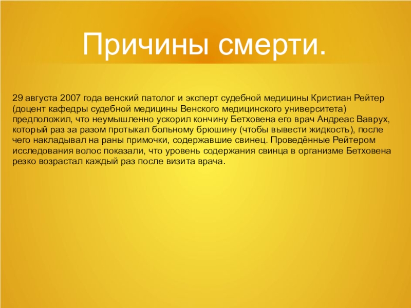 Кристиан Рейтер (доцент кафедры судебной медицины Венского медицинского университета) предположил, что неумышленно ускорил кончину Бетховена его врач Андреас Ваврух, который раз за разом протыкал больному брюшину (чтобы вывести жидкость), после чего накладывал на раны примочки, содержавшие свинец. Проведённые Рейтером исследования волос показали, что уровень содержания свинца в организме Бетховена резко возрастал каждый раз после визита врача.
