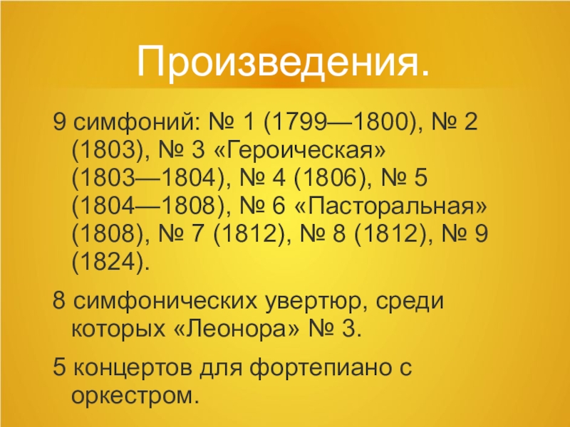 9 симфоний: № 1 (1799—1800), № 2 (1803), № 3 «Героическая»