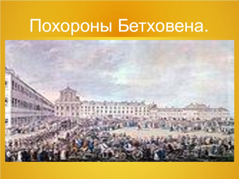Бетховен умер 26 марта 1827 года. Свыше двадцати тысяч человек шли за его гробом. Во время похорон была исполнена любимая заупокойная месса Бетховена Реквием до-минор Луиджи Керубини. На могиле прозвучала речь, написанная поэтом Францем Грильпарцером[7]: