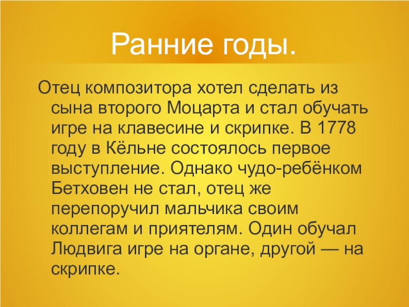 обучать игре на клавесине и скрипке. В 1778 году в Кёльне состоялось первое выступление. Однако чудо-ребёнком Бетховен не стал, отец же перепоручил мальчика своим коллегам и приятелям. Один обучал Людвига игре на органе, другой — на скрипке.