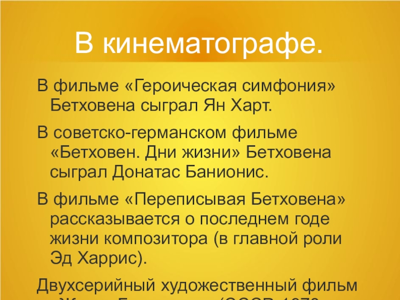В фильме «Героическая симфония» Бетховена сыграл Ян Харт.