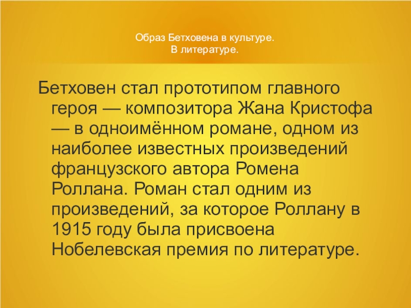 Среди любимых писателей Бетховена — древнегреческие авторы Гомер и Плутарх, английский драматург Шекспир, немецкие поэты Гёте и Шиллер.