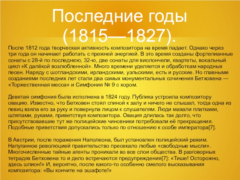 В Австрии, после поражения Наполеона, был установлен полицейский режим. Напуганное революцией правительство пресекало любые «свободные мысли». Многочисленные тайные агенты проникали во все слои общества. В разговорных тетрадях Бетховена то и дело встречаются предупреждения[7]: «Тише! Осторожно, здесь шпион!» И, вероятно, после какого-то особенно смелого высказывания композитора: «Вы кончите на эшафоте!»