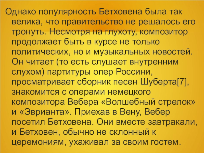 тронуть. Несмотря на глухоту, композитор продолжает быть в курсе не только политических, но и музыкальных новостей. Он читает (то есть слушает внутренним слухом) партитуры опер Россини, просматривает сборник песен Шуберта[7], знакомится с операми немецкого композитора Вебера «Волшебный стрелок» и «Эврианта». Приехав в Вену, Вебер посетил Бетховена. Они вместе завтракали, и Бетховен, обычно не склонный к церемониям, ухаживал за своим гостем.