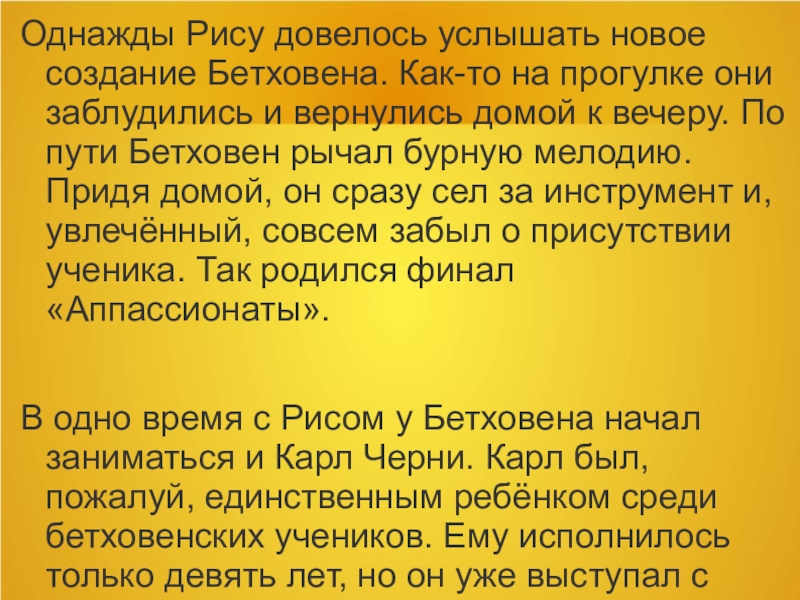 Слайд 21Однажды Рису довелось услышать новое создание Бетховена. Как-то на прогулке они
