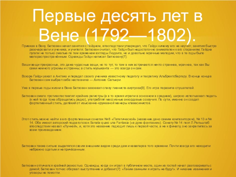 с Гайдном, впоследствии утверждал, что Гайдн ничему его не научил; занятия быстро разочаровали и ученика, и учителя. Бетховен считал, что Гайдн был недостаточно внимателен к его стараниям; Гайдна пугали не только смелые по тем временам взгляды Людвига, но и довольно мрачные мелодии, что в те годы было малораспространённым. Однажды Гайдн написал Бетховену[7]: