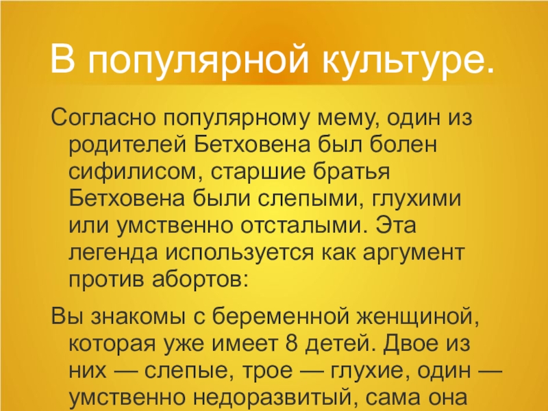 сифилисом, старшие братья Бетховена были слепыми, глухими или умственно отсталыми. Эта легенда используется как аргумент против абортов: