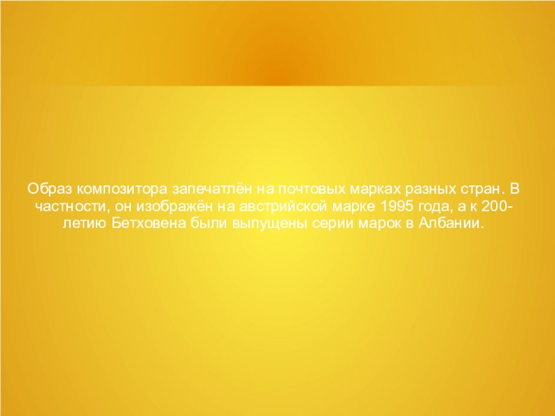 Слайд 38Образ композитора запечатлён на почтовых марках разных стран. В частности, он
