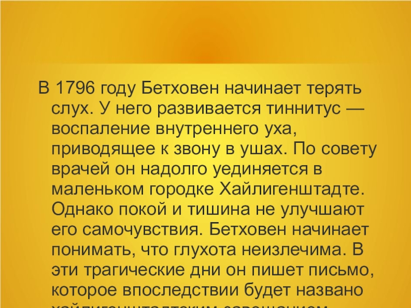 — воспаление внутреннего уха, приводящее к звону в ушах. По совету врачей он надолго уединяется в маленьком городке Хайлигенштадте. Однако покой и тишина не улучшают его самочувствия. Бетховен начинает понимать, что глухота неизлечима. В эти трагические дни он пишет письмо, которое впоследствии будет названо хайлигенштадтским завещанием. Композитор рассказывает о своих переживаниях, признаётся, что был близок к самоубийству.
