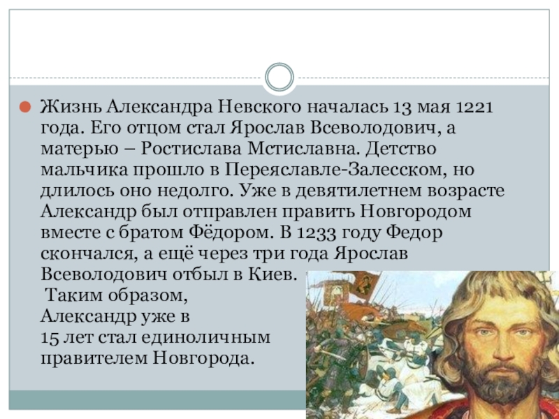 Слайд 2Жизнь Александра Невского началась 13 мая 1221 года. Его отцом стал