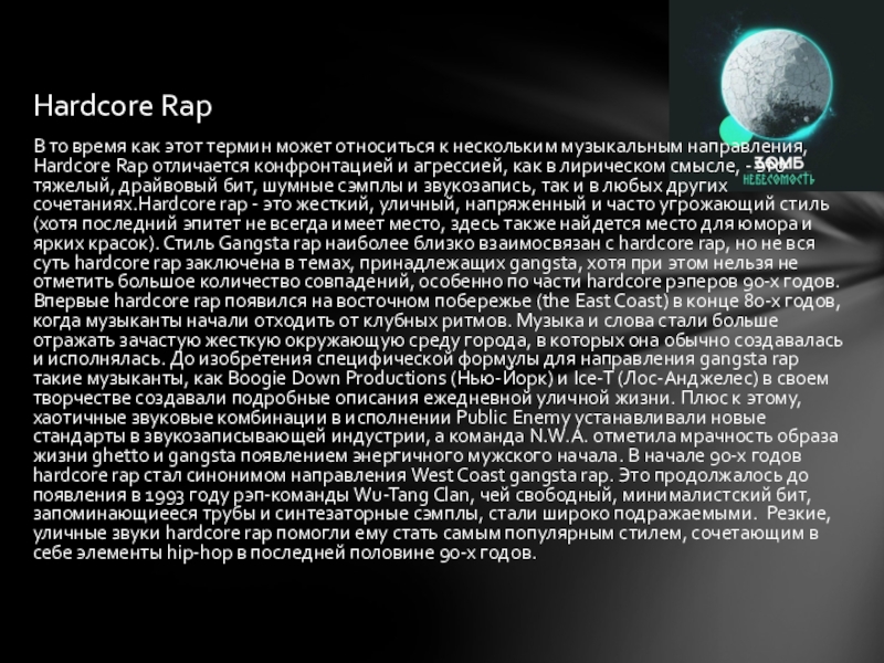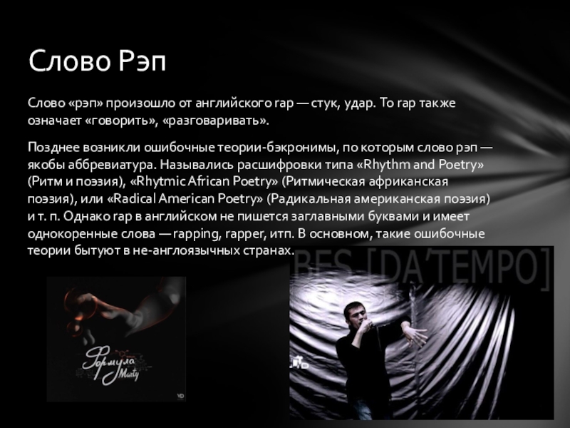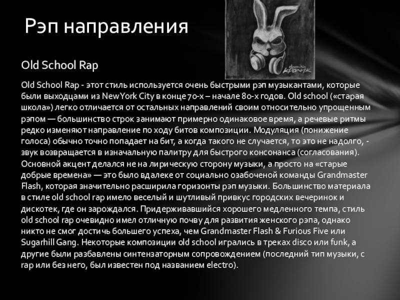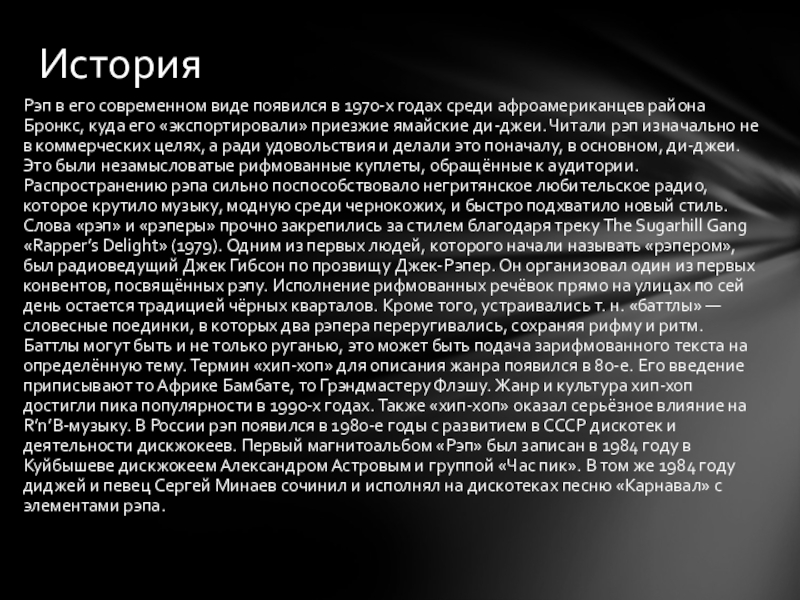 района Бронкс, куда его «экспортировали» приезжие ямайские ди-джеи. Читали рэп изначально не в коммерческих целях, а ради удовольствия и делали это поначалу, в основном, ди-джеи. Это были незамысловатые рифмованные куплеты, обращённые к аудитории. Распространению рэпа сильно поспособствовало негритянское любительское радио, которое крутило музыку, модную среди чернокожих, и быстро подхватило новый стиль. Слова «рэп» и «рэперы» прочно закрепились за стилем благодаря треку The Sugarhill Gang «Rapper’s Delight» (1979). Одним из первых людей, которого начали называть «рэпером», был радиоведущий Джек Гибсон по прозвищу Джек-Рэпер. Он организовал один из первых конвентов, посвящённых рэпу. Исполнение рифмованных речёвок прямо на улицах по сей день остается традицией чёрных кварталов. Кроме того, устраивались т. н. «баттлы» — словесные поединки, в которых два рэпера переругивались, сохраняя рифму и ритм. Баттлы могут быть и не только руганью, это может быть подача зарифмованного текста на определённую тему. Термин «хип-хоп» для описания жанра появился в 80-е. Его введение приписывают то Африке Бамбате, то Грэндмастеру Флэшу. Жанр и культура хип-хоп достигли пика популярности в 1990-х годах. Также «хип-хоп» оказал серьёзное влияние на R’n’B-музыку. В России рэп появился в 1980-е годы с развитием в СССР дискотек и деятельности дискжокеев. Первый магнитоальбом «Рэп» был записан в 1984 году в Куйбышеве дискжокеем Александром Астровым и группой «Час пик». В том же 1984 году диджей и певец Сергей Минаев сочинил и исполнял на дискотеках песню «Карнавал» с элементами рэпа.