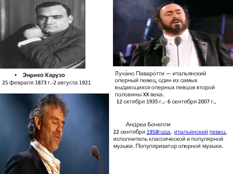 2) Самые известные оперные певцы тоже итальянцы. Даже людям, далеким от оперного искусства, знакомы такие имена как Энрико Карузо, Чечилия Бартолли, Лучано Паваротти, Андреа Бочелли.