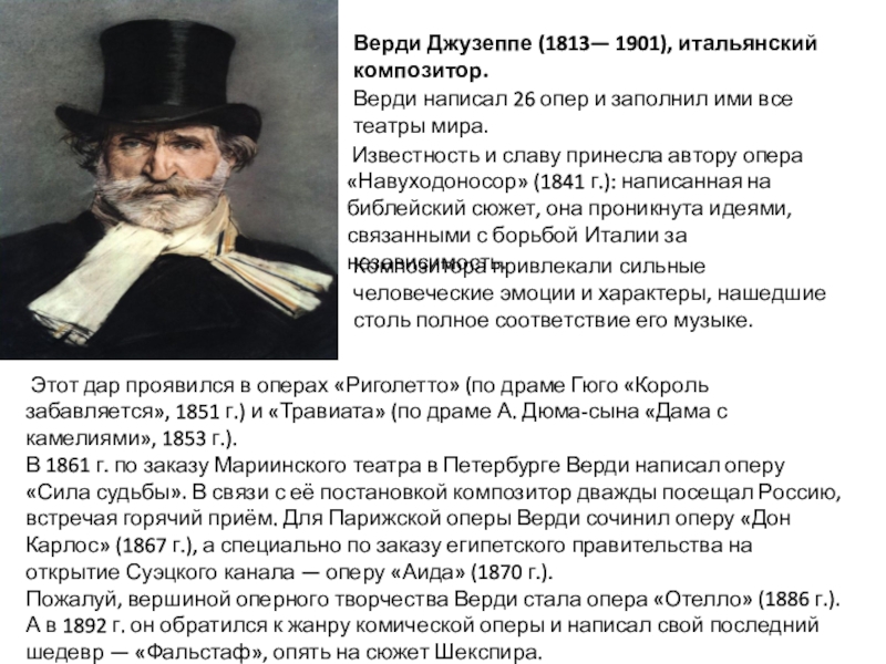 Известность и славу принесла автору опера «Навуходоносор» (1841 г.): написанная на библейский сюжет, она проникнута идеями, связанными с борьбой Италии за независимость.