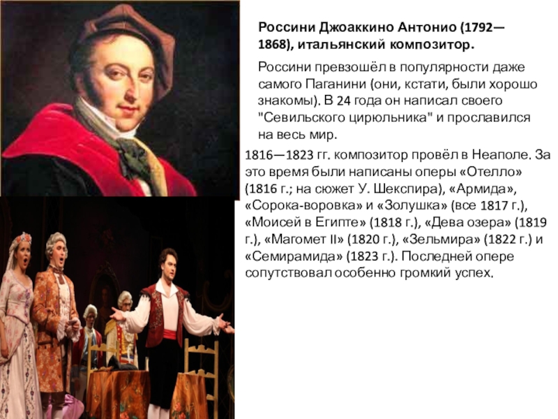 1816—1823 гг. композитор провёл в Неаполе. За это время были написаны оперы «Отелло» (1816 г.; на сюжет У. Шекспира), «Армида», «Сорока-воровка» и «Золушка» (все 1817 г.), «Моисей в Египте» (1818 г.), «Дева озера» (1819 г.), «Магомет II» (1820 г.), «Зельмира» (1822 г.) и «Семирамида» (1823 г.). Последней опере сопутствовал особенно громкий успех.